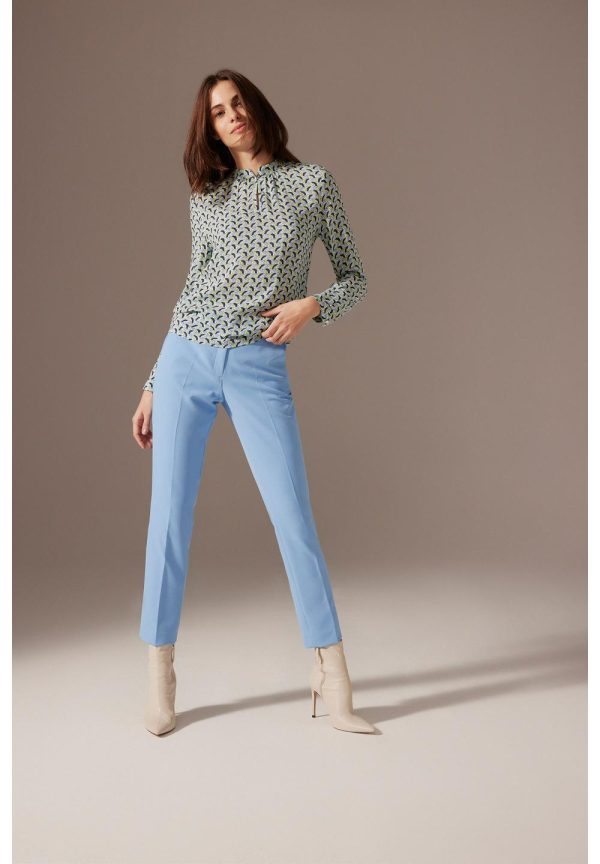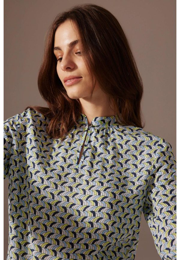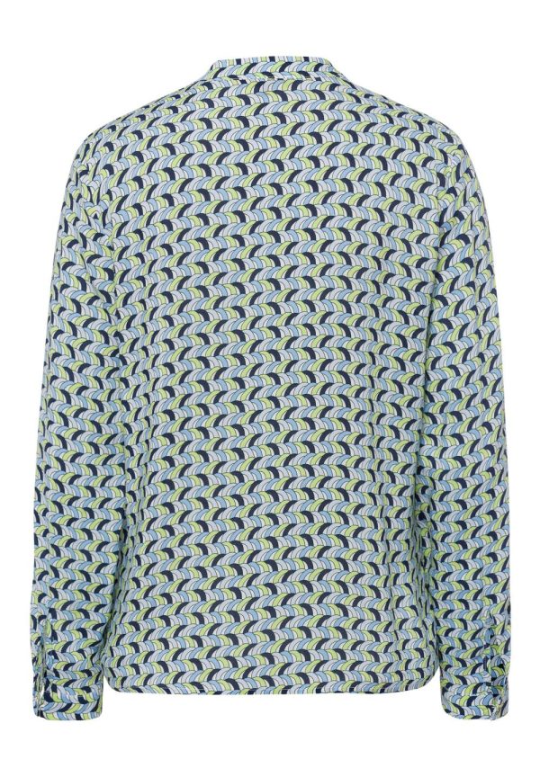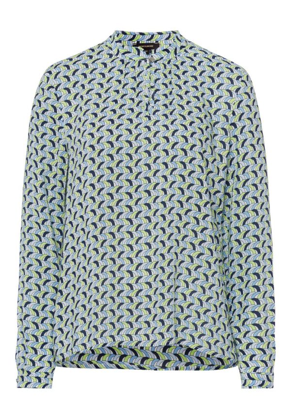 Attraktive Bluse von MORE & MORE in fließender Viskose mit graphischem Minimuster in hellblau/grün/marine auf hellem Fond.