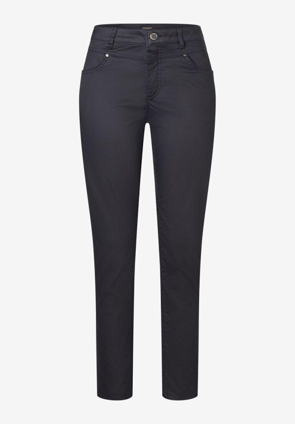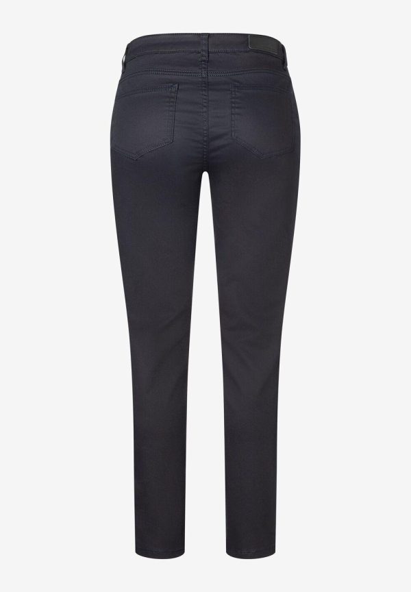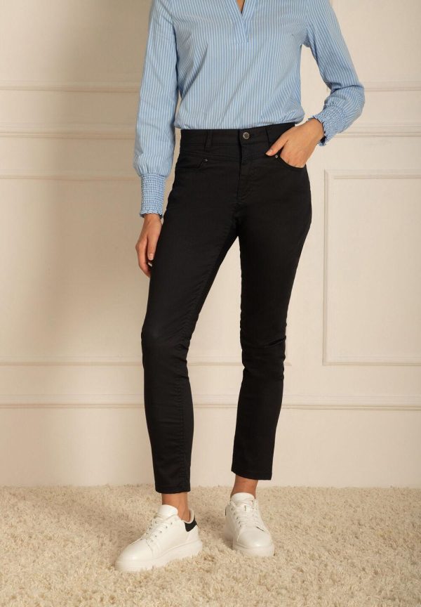 Die coole Slim Pants von MORE & MORE in angesagtem coated Denim macht eine tolle Figur und sieht sowohl zur fießenden Chiffonbluse als auch zum lässigen Ringelshirt genial aus.