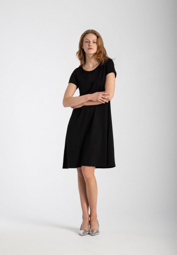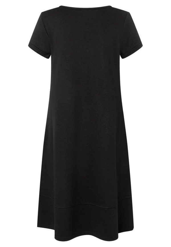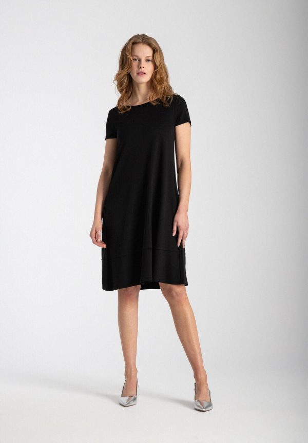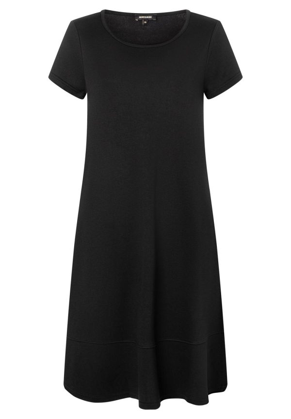 Schlicht und unkompliziert präsentiert sich das schwarze Jerseykleid von MORE & MORE mit rundem Ausschnitt und kurzen Ärmeln. Der lockere Schnitt und das angenehm fließende Material garantieren einen hohen Tragekomfort und machen das Kleid zum absoluten Lieblingsteil.