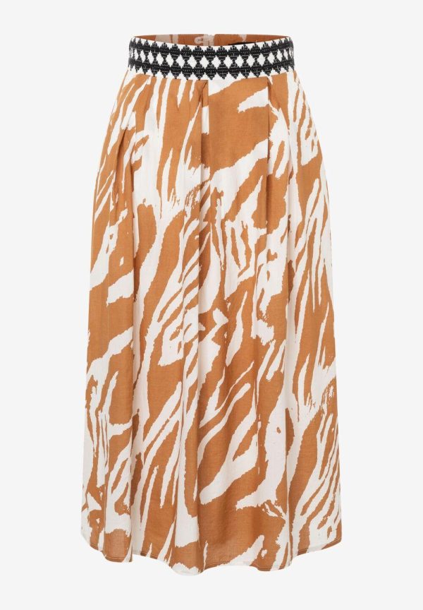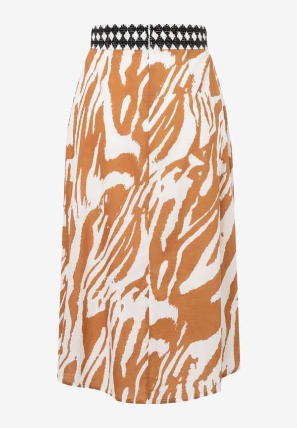 Der moderne, midilange Baumwoll-Rock von MORE & MORE mit zweifarbigem Zebra-Print in camel/weiß und schwarz/weißem Rautenbund sieht super mit Shirts und Blusen aus .