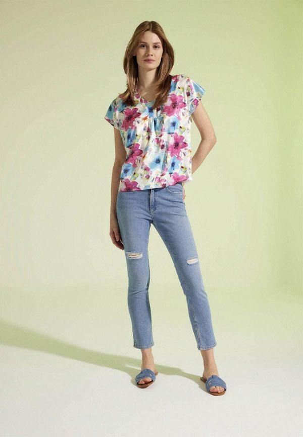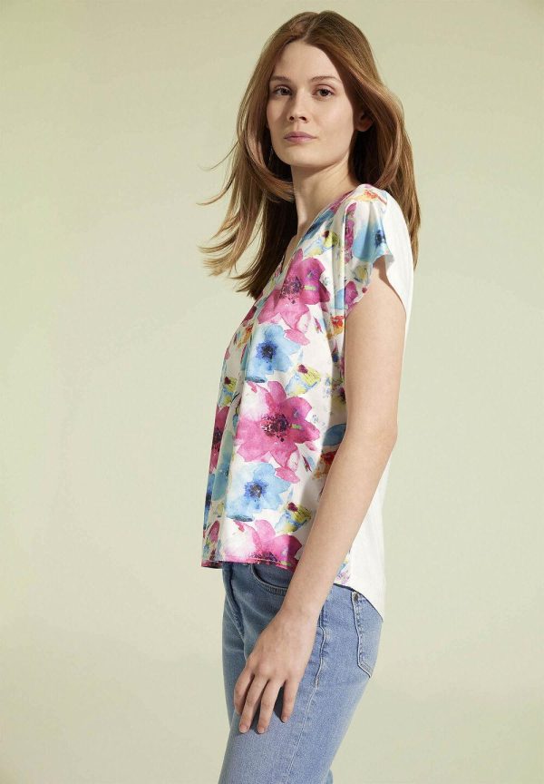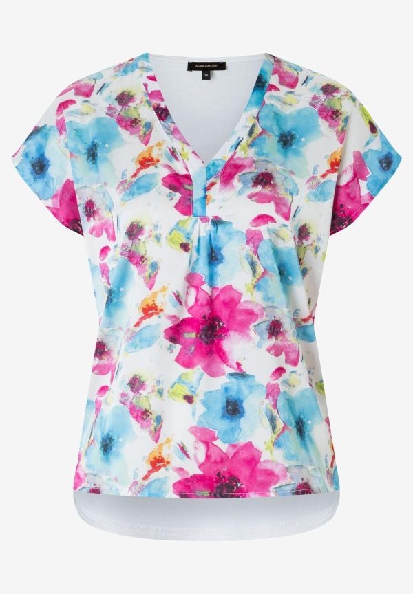 Das feminine Printshirt von MORE & MORE mit seidig-glänzender Webfront und softem Jerseyrücken bietet die perfekte Mischung aus Bluse und T-Shirt und lässt sich vielseitig kombinieren.