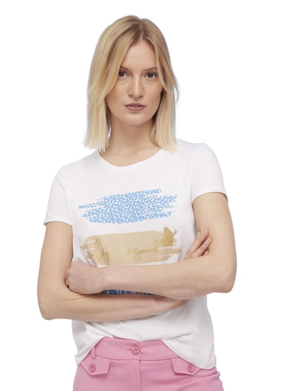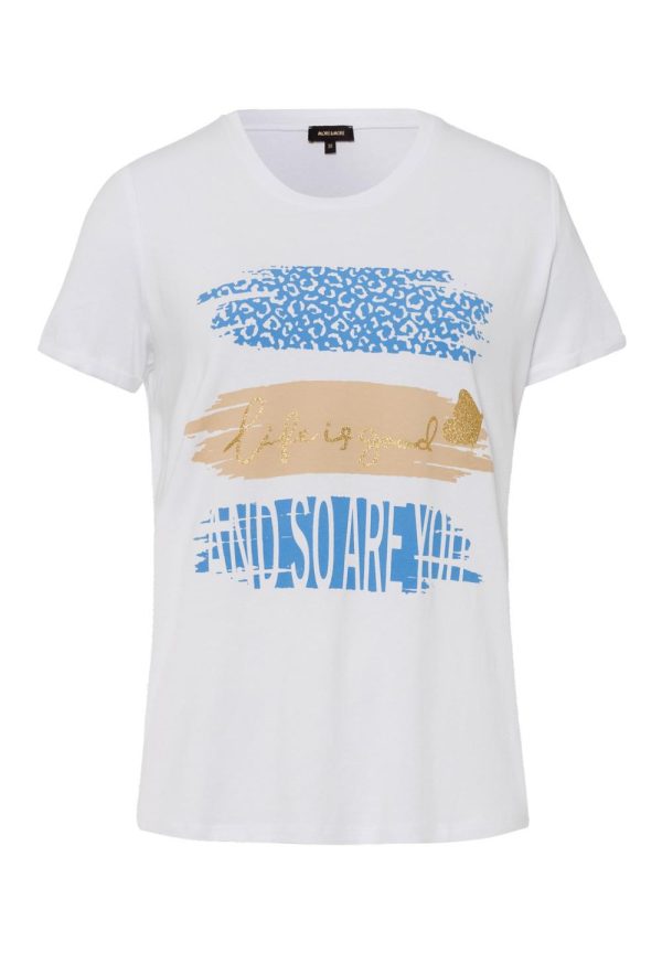 Attraktives T-Shirt von MORE & MORE mit mehrfarbigem Frontprint und Glitzer-Schriftzug.